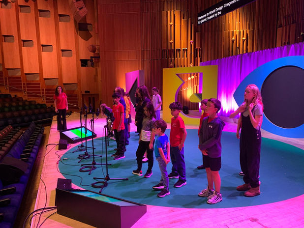 We were blessed to have been invited to open The World Design Congress performing on The wonderful Barbican stage. We were asked to perform My Earth, mainly because the extraordinary voice of Jane Goodall was to make her address following our performance. We were to walk onto the stage with no announcement, perform our song and leave the stage, opening the way for one of Jane's last addresses to us all. What an honour! What a moment for our children' s choir to have been there. Thank you, World Design Congress for inviting us.